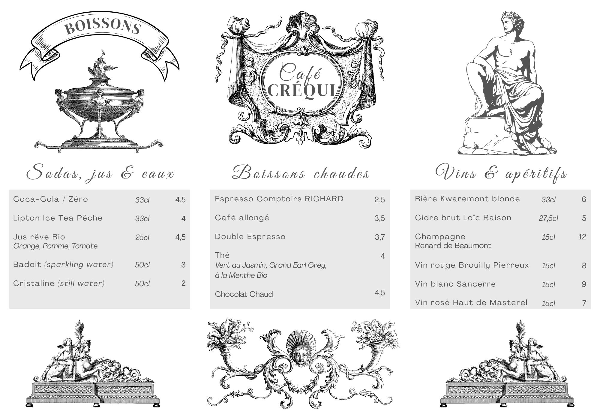En terrasse ou à l’intérieur des beaux décors feutrés signés Jacques Garcia, venez déjeuner ou prendre un thé au Café Créqui.